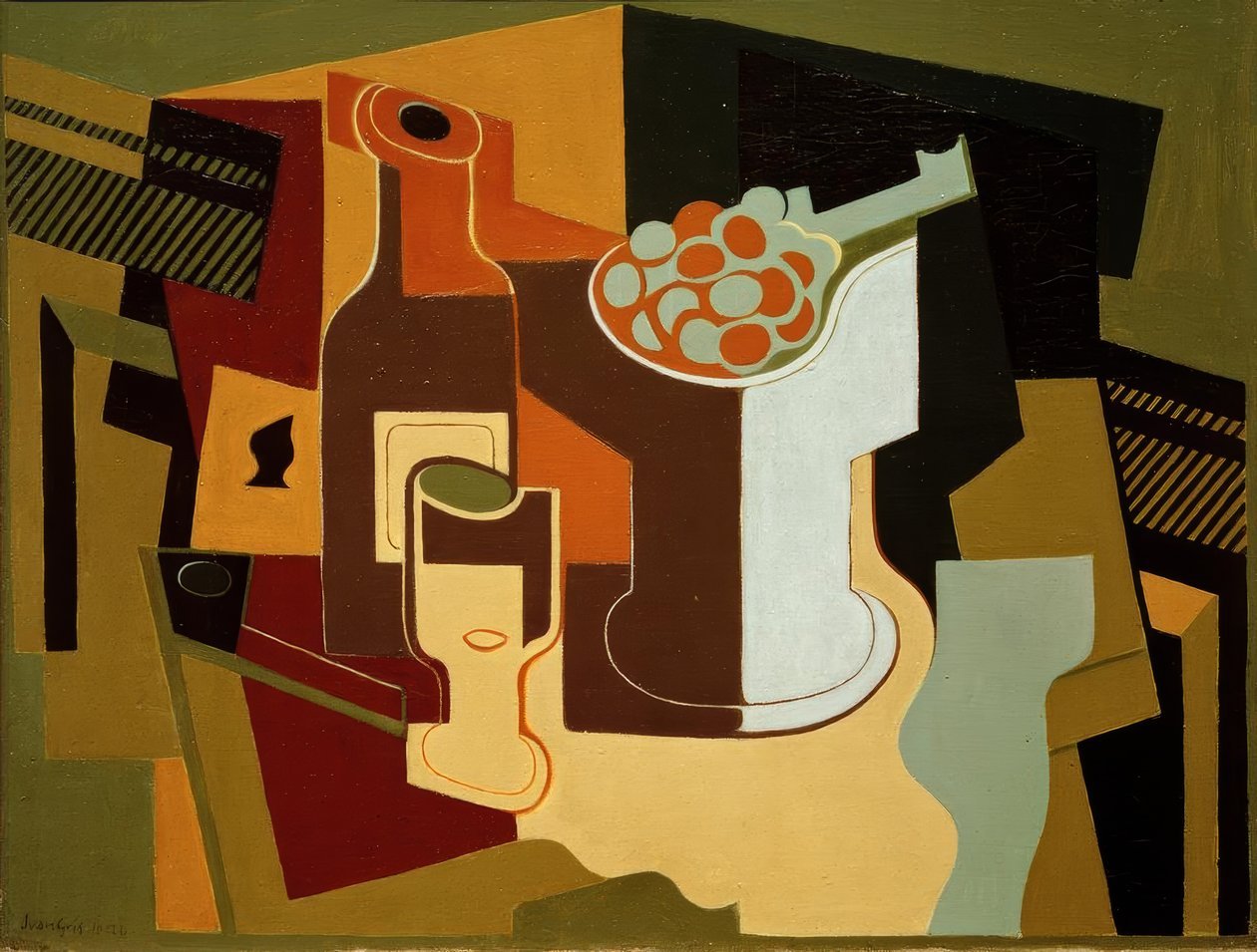Botella y frutero (1912) de Juan Gris presenta una naturaleza muerta construida con formas geométricas y una composición analítica muy ordenada. Los objetos cotidianos, como la botella y el frutero, se transforman en estructuras conceptuales, mostrando cómo el Cubismo convierte lo simple en una forma de análisis visual.